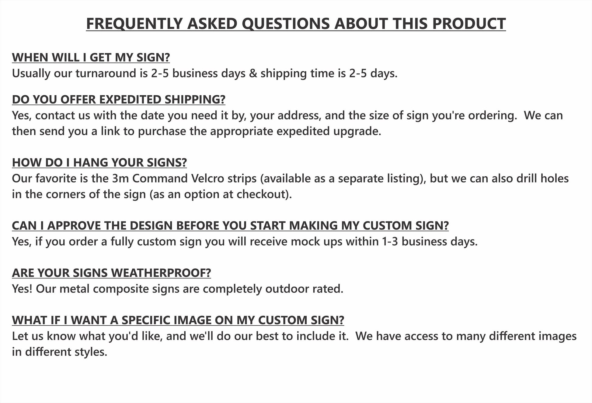 At times we like to share some of the custom signs we make to others for marketing purposes to show them the types of things we have done. We may even decide to use some of the more general ones as new product offerings. We reserve the right to reuse the layout and textual content for other products. If you would not like your sign photo to be shared, please let us know and we will respect that; after all, we're real people too and want you to feel comfortable with your purchase. Thank you so much!